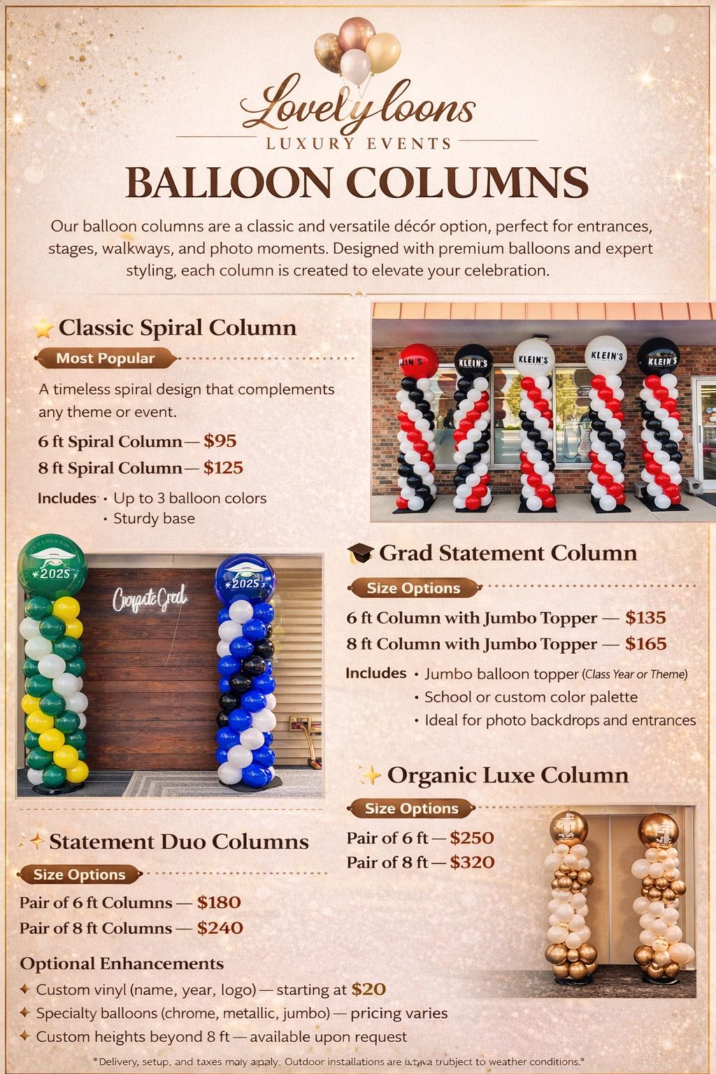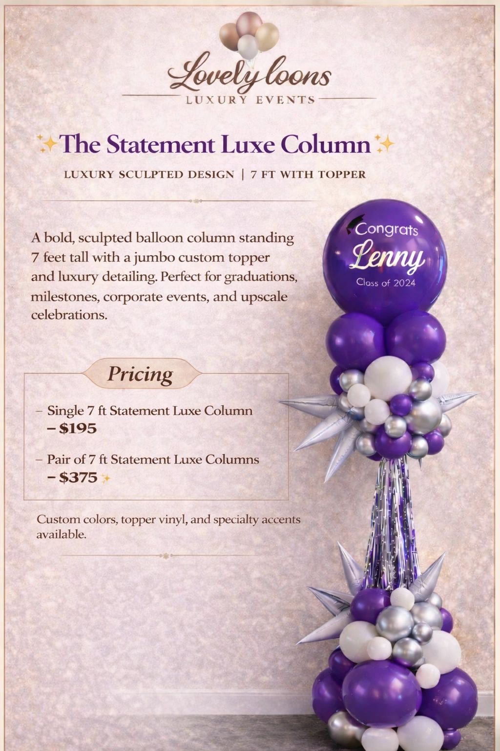 Our standard balloon column heights are 6 ft and 8 ft. Custom heights beyond 8 ft are available upon request and quoted based on design and setup requirements.