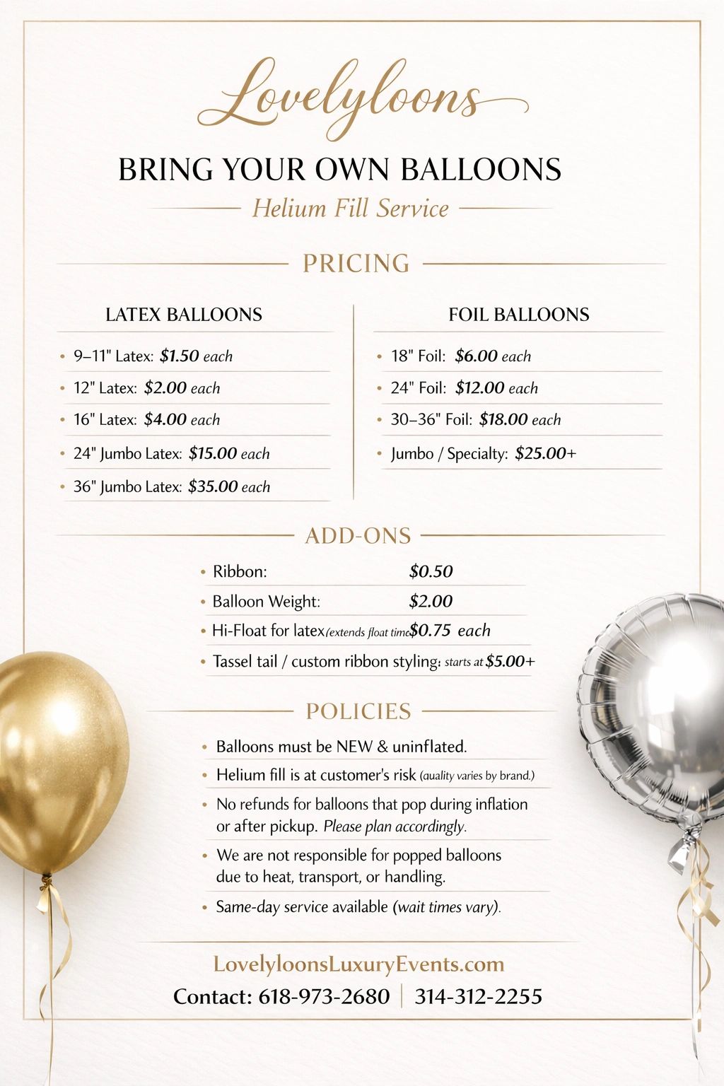 • BYOB (Bring Your Own Balloons) is available. For faster pickup, please drop off balloons at least 24 hours in advance. Pickup is available for select items.