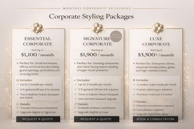 Services may include event styling, balloon décor, rentals, installations, photo moments, and branded experiences based on your selected retainer scope.