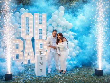 8-Foot Tall "Oh Baby" Lighted Marquees Stacked. Balloons are available in up to three colors. Four Powder/Confetti cannons. Two Cold sparks and TNT box for illusion.