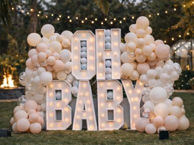 8-Foot Tall "Oh Baby" Lighted Marquees Stacked. Balloons are available in up to three colors.