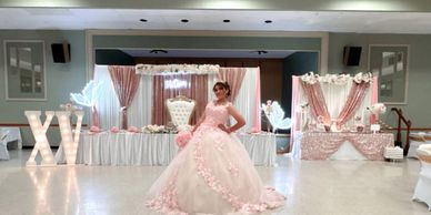• Decoración para hasta 3 mesas principales (quinceañera y su corte – hasta 15 personas)